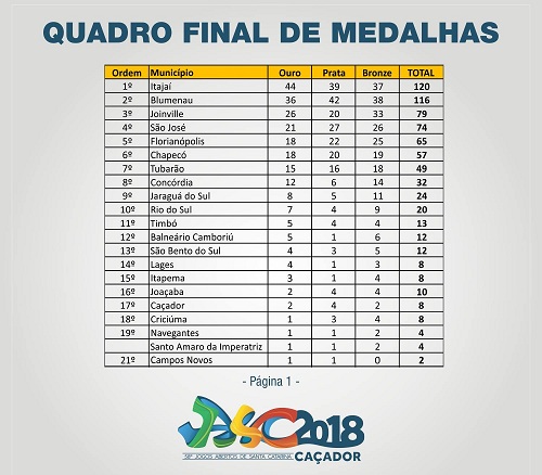 Os blumenauenses fizeram muita festa pela reconquista depois de três anos, na entrega da premiação. Os itajaienses foram campeões em 2014 e 2015. A edição de 2016, em Tubarão, foi cancelada, e Itajaí levou o titulo no ano passado, em Lages, por diferença de apenas oito pontos. O sábado encerrou com a diferença de 22 pontos em favor de Blumenau. A comemoração antecipada veio com o troféu do caratê masculino, mesmo sem o resultado do confronto entre os dois municípios no handebol.