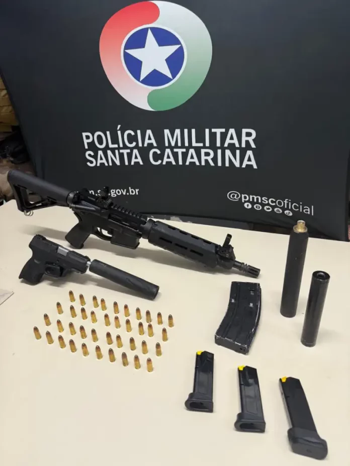 Imediatamente, uma equipe policial deslocou-se até o local, onde, após buscas, conseguiu localizar um fuzil AR-15 de calibre 5.56mm, uma pistola Taurus G2C de 9mm, além de quarenta munições de 9mm e três supressores de ruído. A operação, que visava garantir a segurança da população, resultou na apreensão de armamentos de alto poder de fogo.