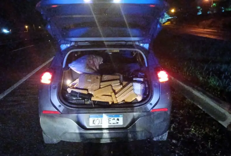 Durante a inspeção, os agentes encontraram os tabletes de maconha no porta-malas e no banco traseiro. Logo depois, a vistoria confirmou que o GM Tracker rodava clonado e usava placas falsas idênticas às de outro veículo.