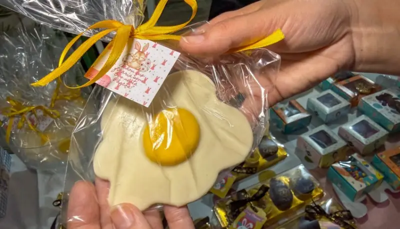Pessoa segura um doce artesanal em formato de ovo frito, embalado para presente, representando produtos criativos de pequenos negócios para a Páscoa.
