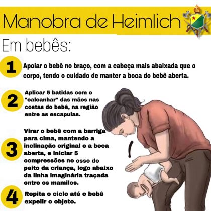 A manobra de Heimlich adaptada para bebês é a mais indicada para promover a desobstrução das vias áreas. O procedimento está dentro do ról obrigatório em cursos de primeiros socorros a profissionais de educação a partir da Lei Lucas. Fora do ambiente escolar, porém, quando um acidente assim acontece, as pessoas buscam a ajuda das forças de segurança para o salvamento. Az cartilhaz abaixo (do CBM-Acre) explicam os termos gerais da manobra de acordo com a idade da pessoa engasgada.