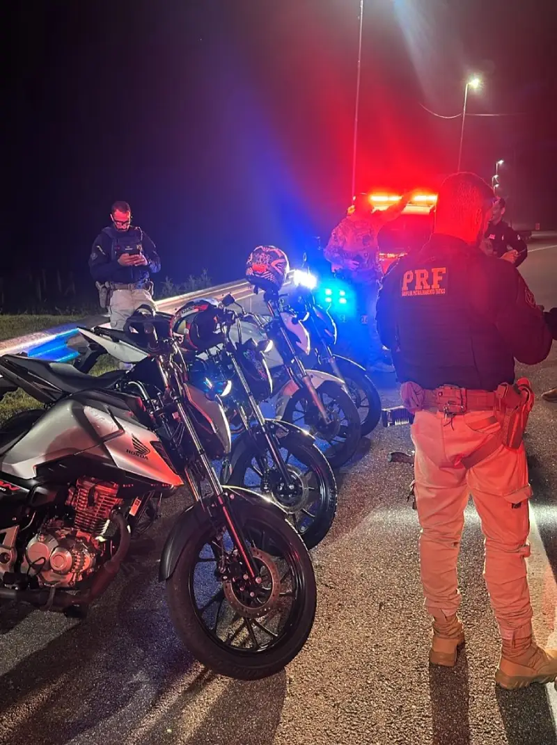 Diante das informações, a PRF montou uma barreira no trecho. Em seguida, as motocicletas se aproximaram em alta velocidade. No entanto, ao perceberem a presença policial, os condutores desobedeceram a ordem de parada e tentaram fugir pela contramão da rodovia. Ainda assim, os policiais conseguiram bloquear a via e interceptar o grupo.