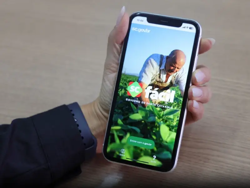 Pessoa segura um celular com a tela aberta no aplicativo SC Fácil, que mostra a interface inicial da plataforma digital do Governo de Santa Catarina, usada para acessar serviços públicos de forma online.