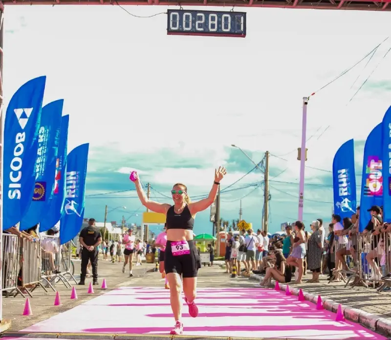 Participante cruza a linha de chegada do Sicoob Run Mulher, celebrando a conclusão da corrida e incentivando a prática esportiva e o bem-estar feminino.